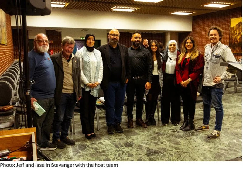The tour began in Oslo, where I was joined by Issa Amro, who is the courageous leader of Youth Against Settlements in Hebron, on the front lines of the Palestinian struggle. Issa and I were nominated this year for the Nobel Peace Prize by the Palestinian Solidarity Committee of Norway by way of Ingrid Fiskaa, an MP of the Socialist Left Party. In Oslo we met with members of parliament, gave several public lectures and met with local activists, then travelled to Stavanger for another public event and a meeting with Palestinian students at the university.